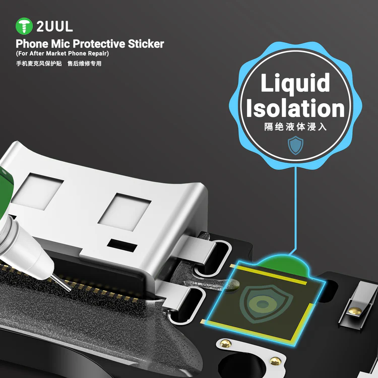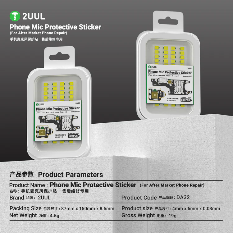 The 2UUL DA32 Phone Mic Protective Sticker is designed to ensure optimal performance during aftermarket phone repairs. With 500 pieces per pack, this product serves as a reliable solution for technicians who value precision and quality. These stickers act as a protective barrier for phone microphones, safeguarding them from dust, debris, and accidental damage during repair procedures.