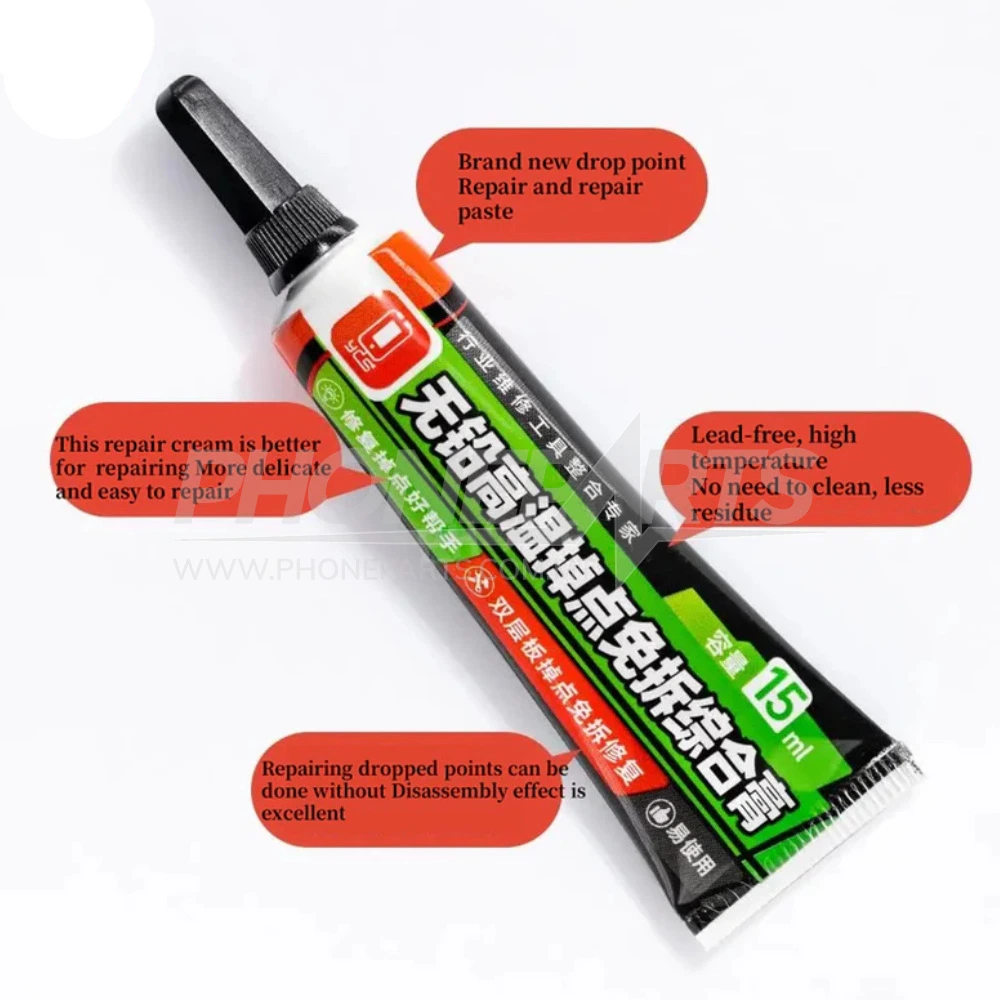 YCS 7SS Solder Flux halogen-free lead-free Welding Oil easy Tinning for mobile phone computer PC BGA chip soldering and repair. YCS Lead-free High Temperature Drop Point Free Disassembly Comprehensive Paste for mobile phone repair. YCS lead-free halogen-free no-clean solder flux for PCB circuit board BGA chip soldering repair. A good soldering helper, not easy to get dirty and easy to use. Lead-free and halogen-free solder paste. Easy to tin, greatly improve welding efficiency.